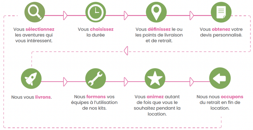 Parce que vous pensez que tous les enfants devraient vivre des aventures exceptionnelles, parce que vous tenez à allier le ludique à la pédagogie, parce qu’il vous faut un haut niveau de qualité,… et parce que vous souhaitez être autonome dans l’organisation des animations : nous avons mis en place pour vous un service de location courte ou longue durée de nos kits d’animation !